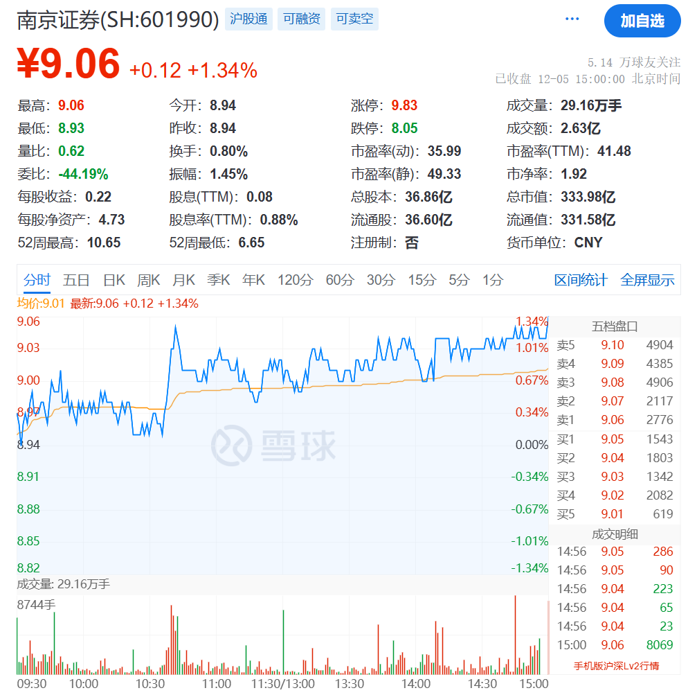 Wind数据涌现,当今南京证券的第一大鼓励为南京紫金投资集团有限职守公司(抓股比例为25.01%),实控东说念主为南京市国资委。终结12月5日收盘,南京证券股价为9.06元/股,总市值为334亿元。