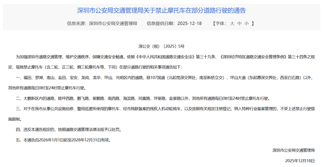交管部门在续发“禁摩令”的解读中强调,此举的主要任务是,加强深圳市摩托车安全解决责任,明确深圳市摩托车禁行说念路,防患摩托车安全事故。